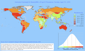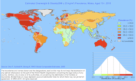 Abaixo, vemos no mapa-mundi as prevalências alarmantes de adultos com Índice de Massa Corporal acima de 25 (sobrepeso + obesidade), separadados por sexo. As imagens foram retiradas do site da OMS, que mantém uma base de dados atualizada sobre o tema (para acessar clique aqui).